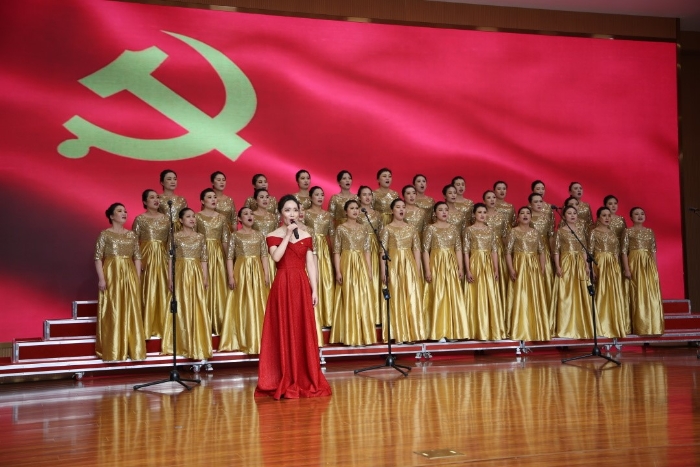 在“红歌颂党恩,奋进新征程”的歌咏比赛中,红桃国际药业选派了党务干部、综合党员、巾帼党员和青年党员4支代表队,分别登台,深情唱响《没有共产党就没有新中国》。