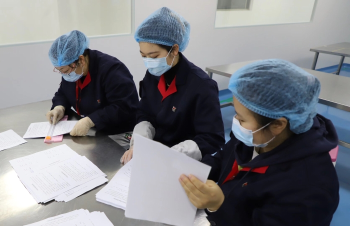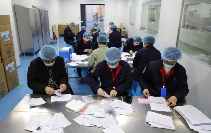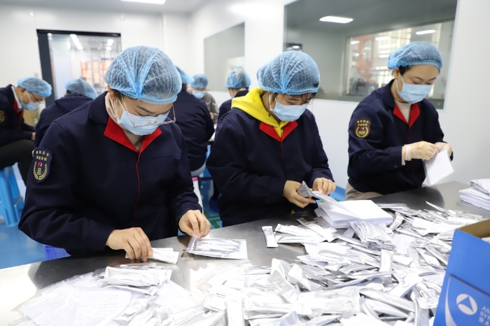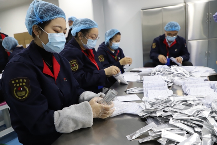 自3月7日晚任务下达以来,在红桃国际药业固体制剂工厂,各条流水线停下原定任务,全面调整生产设备和工艺流程,不计成本、不计代价,开足马力生产抗疫协定方。据悉,此次生产的抗疫协定方为三批共计36万袋,可供一万人五天使用。固体制剂工厂负责人介绍,按常规计划,原本这批协定方需要一个星期的生产周期,但疫情不等人、防控就是命令,港城人民的需要就是红桃国际 的职责,将保证连续奋战三天完成这批协定方。近30名行管、研发的同志也纷纷主动赶来支援,投入防疫物资包装任务。