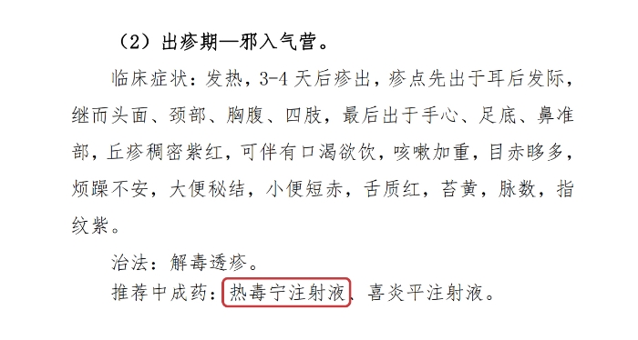 其中,《麻疹诊疗方案(2024版)》中介绍,麻疹以外透为顺,内传为逆。麻为阳毒,以透为顺,以清为要,故清热透疹为基本治则。其中“顺证”诊疗分为前期、出疹期和恢复期三个极端,在病情发展到“出疹期”时,方案推荐使用热毒宁注射液。