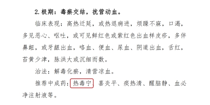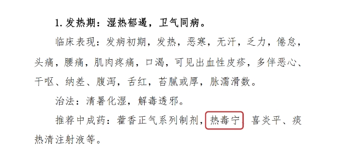 另一份《登革热诊疗方案(2024版)》中也详细介绍了如何运用中医中药的诊疗方法来对付登革热疾病,其中在病情“发热期”和“极期”,方案都推荐使用热毒宁注射液来控制和治疗病证。
